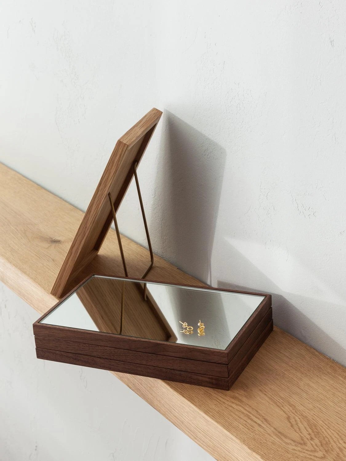 Materials:Β Wood (walnut or oak) with a clearΒ oil finish, brass, mirror