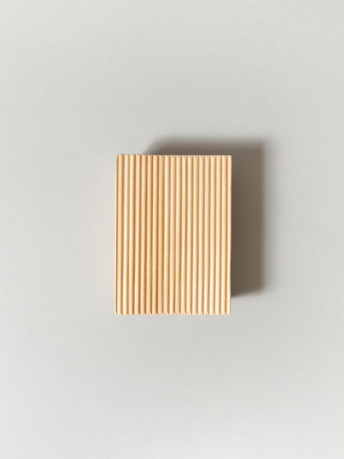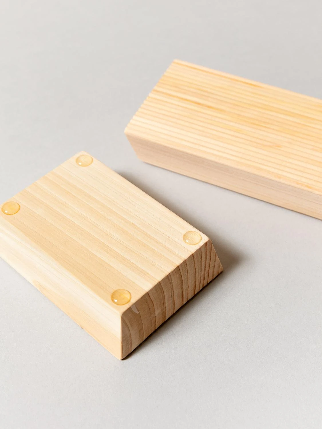 The aromatic Hinoki Earth Saver Soap Rest is made from sustainably sourced Japanese cypress. Add this simple wooden object to your kitchen or bath and add a touch of verdant fragrance to your everyday life. Also pictured: Hinoki Forest Shower Soap, sold separately.