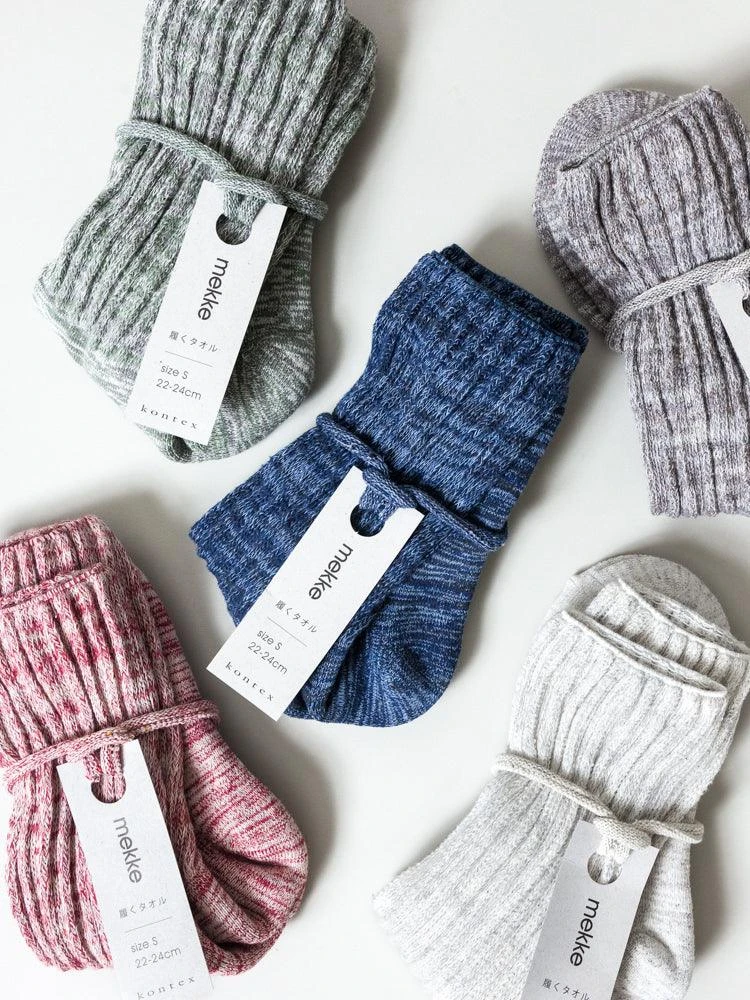 With a comfortable fit from toe to heel, these lightly cushioned socks will quickly become the ones you reach for when you have a long day ahead of you. Taking their name from the Japanese slang word mekke-mono (meaning “good find”), Mekke Socks are woven on the same slow looms as many of our favorite Kontex towels. Each pair comes in one of several heathered pastel colors and features plush and absorbent terry on the sole to help prevent the dreaded feeling of sweaty feet.