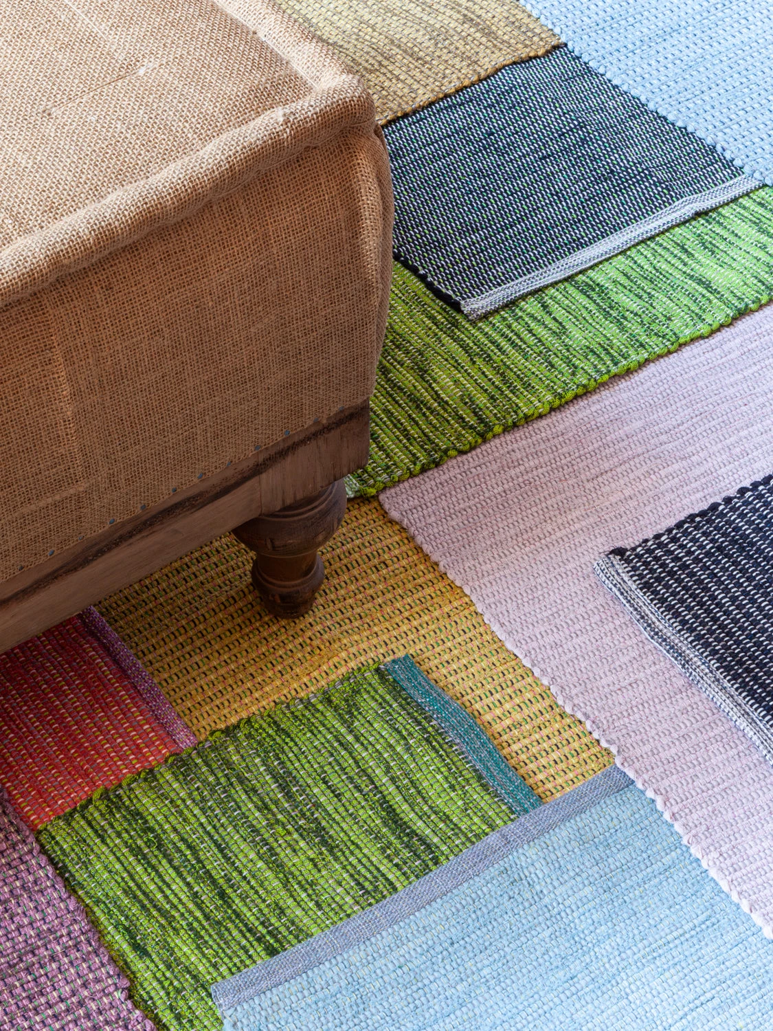 While they span four broad color categories: Pink, Yellow, Blue, and Green, a closer look reveals that no two rugs are the same — the whimsical result of being stitched together by hand.