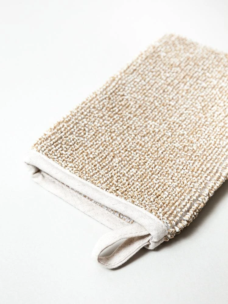 Designed to treat severely dry skin, this handy mitten is roughly textured to exfoliate and revitalize your body in the shower. The all-natural Sasawashi fabric is made from absorbent washi and deodorizing kumazasa plant fibers that prevent mildew growth and fiber breakage. Both sides feature a pilled coarse, sand-like texture that is ideal for buffing away calluses from areas like feet and elbows. Designed for intensive weekly use, this mitt softens under running water and features a corner accent loop to hang dry after use.