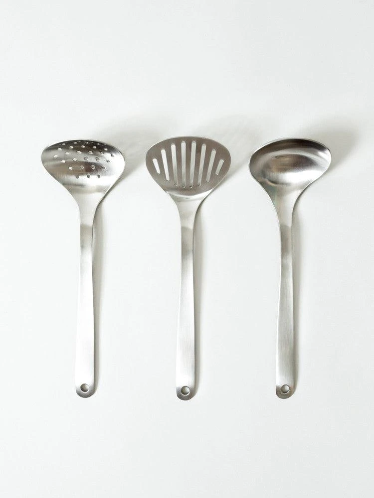 This collection of essential kitchen tools is made in the Niigata region of Japan, an area renowned for producing metal wares of the highest quality. Each set includes a ladle, spatula, and serving spoon. Winner of the 2008 Good Design Award.Â