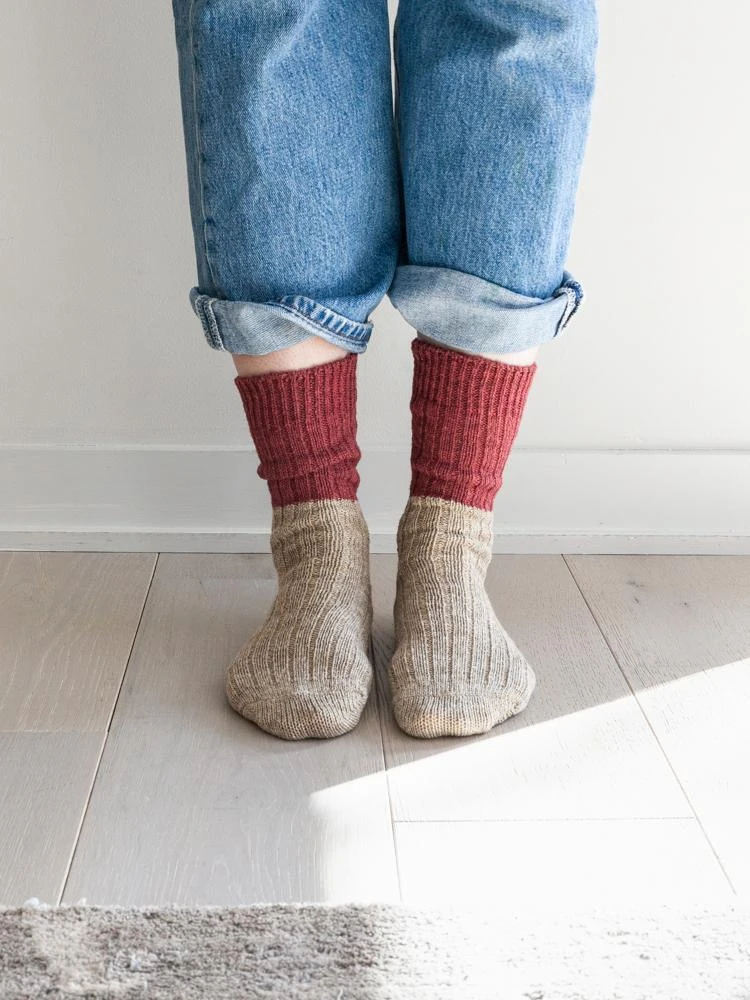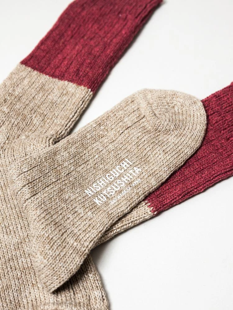 Cotton and wool combine to create a pampering pair of comfy, cozy socks. By gently twisting both types of thread, Nishiguchi Kutsushita fuses the best qualities of each material to make a yarn that envelops your feet with softness and warmth – and they only get softer with each wear.